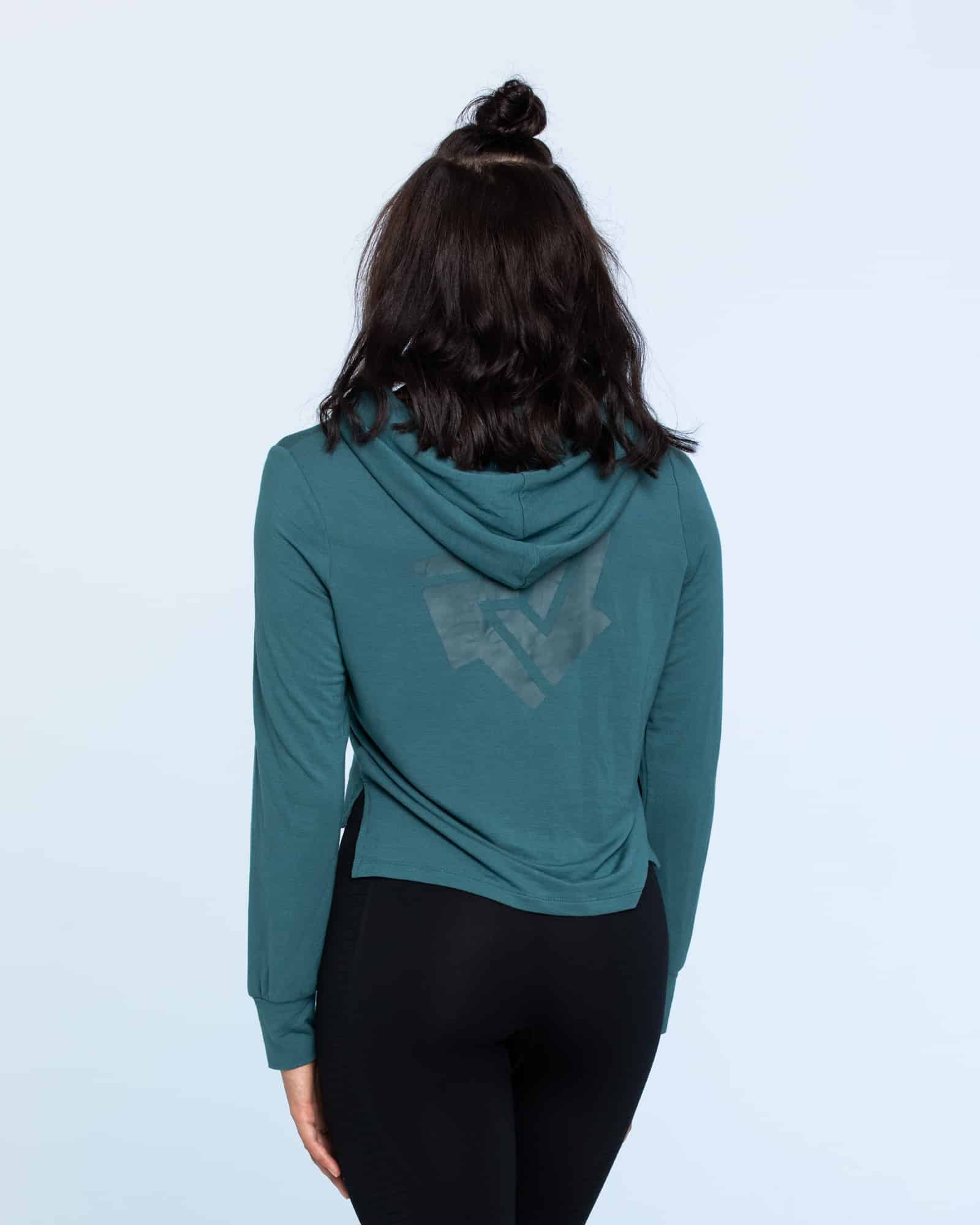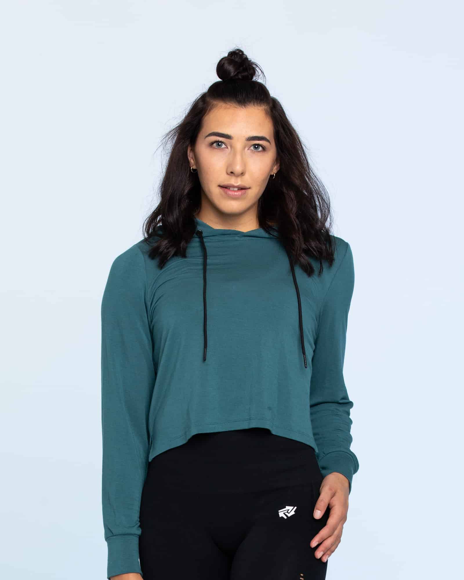 Look great without compromising comfort in the super-comfy "Cue the Applause" crop hoodie. Our softest hoodie yet features a unique blend of fabrics that pack flexibility, comfort and sweat wicking technology into a hoodie ready for training or everyday wear. This gorgeous muted teal hoodie is designed in a cropped, formfitting design that easily slips over your workout outfit.